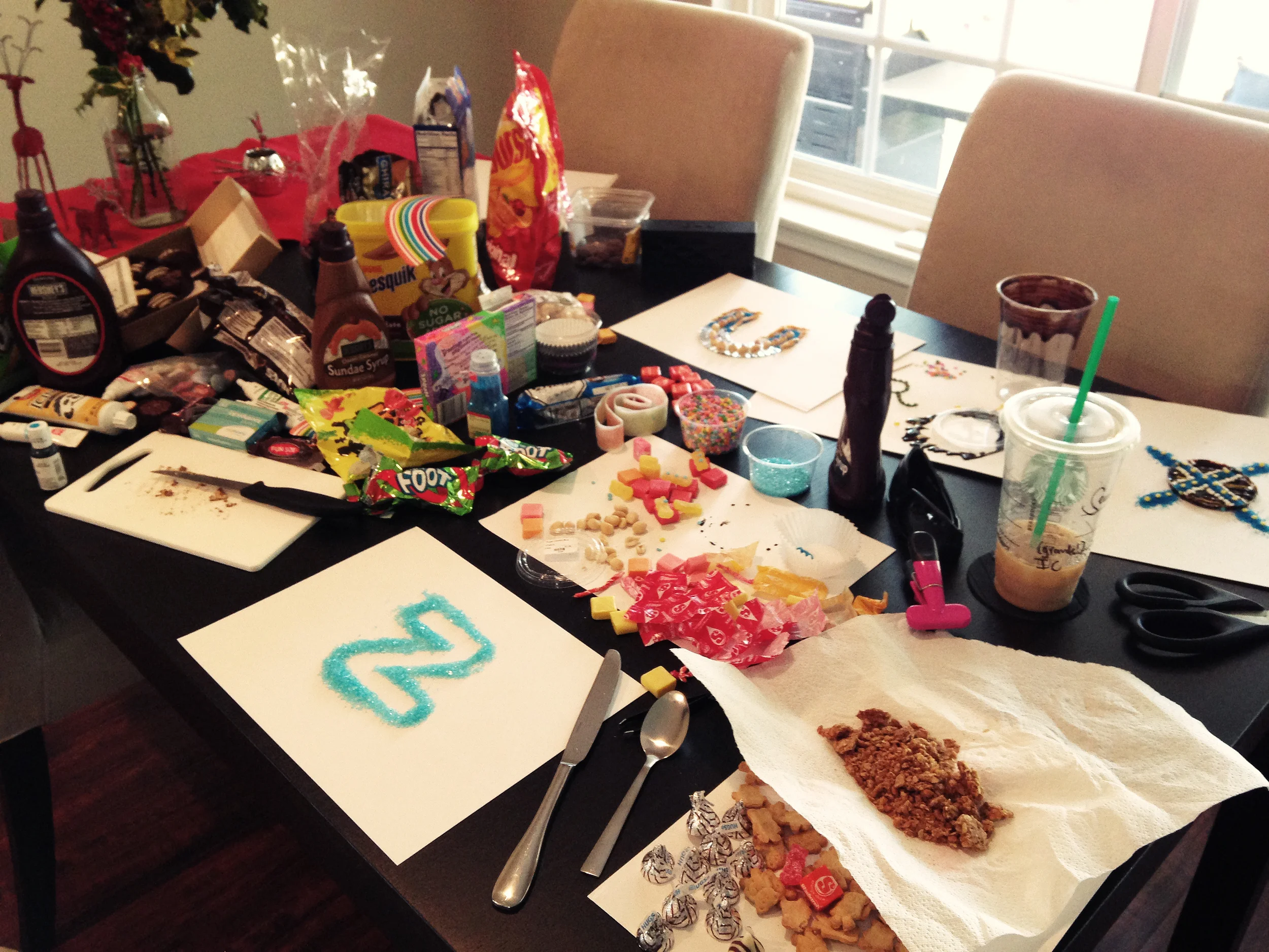 I had a pantry full of leftover baking/decorating supplies that I’d used for a fancy birthday cake a few years ago, so I decided to create my letters out of these materials. I spent a messy Sunday afternoon smearing peanut butter, drizzling syrup, and scattering sugar crystals all over my dining room table. Unfortunately I only had a couple of hours to complete an entire alphabet, so I couldn’t spend too much time on each letter. I would love to return to this project at some future date and dedicate even more time to each letter and tighten everything up. But for the materials I had on hand as well as the limited amount of time, I think my alphabet turned out pretty “sweet”!